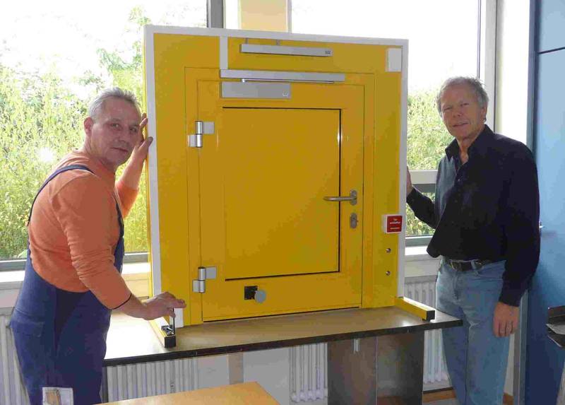 Für Herrn Knopp (re), Lehrer für den Metallbau an der Landrat-Gruber-Schule, und seine Schüler ist jetzt schon Weihnachten. Gerade bekommt er die ersehnte Feuerschutz - Demo- und Übungstür durch Herrn Plamitzer (li), Erbauer derselben und Mitarbeiter der Josef Roßkopf Metallbau GmbH in Eppertshausen, überreicht.