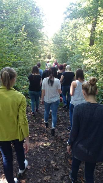Um die Umgebung zu erkunden, machten wir eine kleine Wanderung, die eine Kleingruppe vorbereitet hatte. Unsere erste Station war ein Blindenparcours, der mit Hilfe von Seilen mitten im Wald platziert war. Dementsprechend gab es einige Stellen auf dem Weg, die man ohne Hilfe wohl schwer bewältigen hätte können. Also gingen wir immer zu zweit den Pfad ab. Es war eine seltsame Erfahrung, blind diesen Parcours zu bezwingen, auf Hilfe anderer angewiesen zu sein und sich vor allem auf seinen Tast- und Hörsinn zu verlassen.