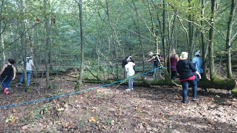 Danach ging es weiter mit der Einführung in den mobilen Seilgarten. Die eine Gruppe blieb bei Herrn W. und die andere Gruppe ging mit Frau Neuroth. Die Gruppe um Herr W. durfte dann den mobilen Seilgarten nutzen. Besonders herausfordernd war das Balancieren auf einem zwischen zwei Bäumen gespanntes Seil, das circa 7 Meter über dem Boden war. Auch für das Herunterkommen von dem Seil war sehr viel Vertrauen von Nöten. Denn wir sollten uns einfach fallen lassen, nur gesichert von einem Seil und einem wildfremden Mann. Nach dem Abschließen des Seilgartens tauschten wir die Gruppen. So ging es weiter mit dem was Frau Neuroth für uns vorbereitete. Wieder ging es durch einen Blindenparcours. Diesmal mit deutlich mehr und anspruchsvolleren Hindernissen.