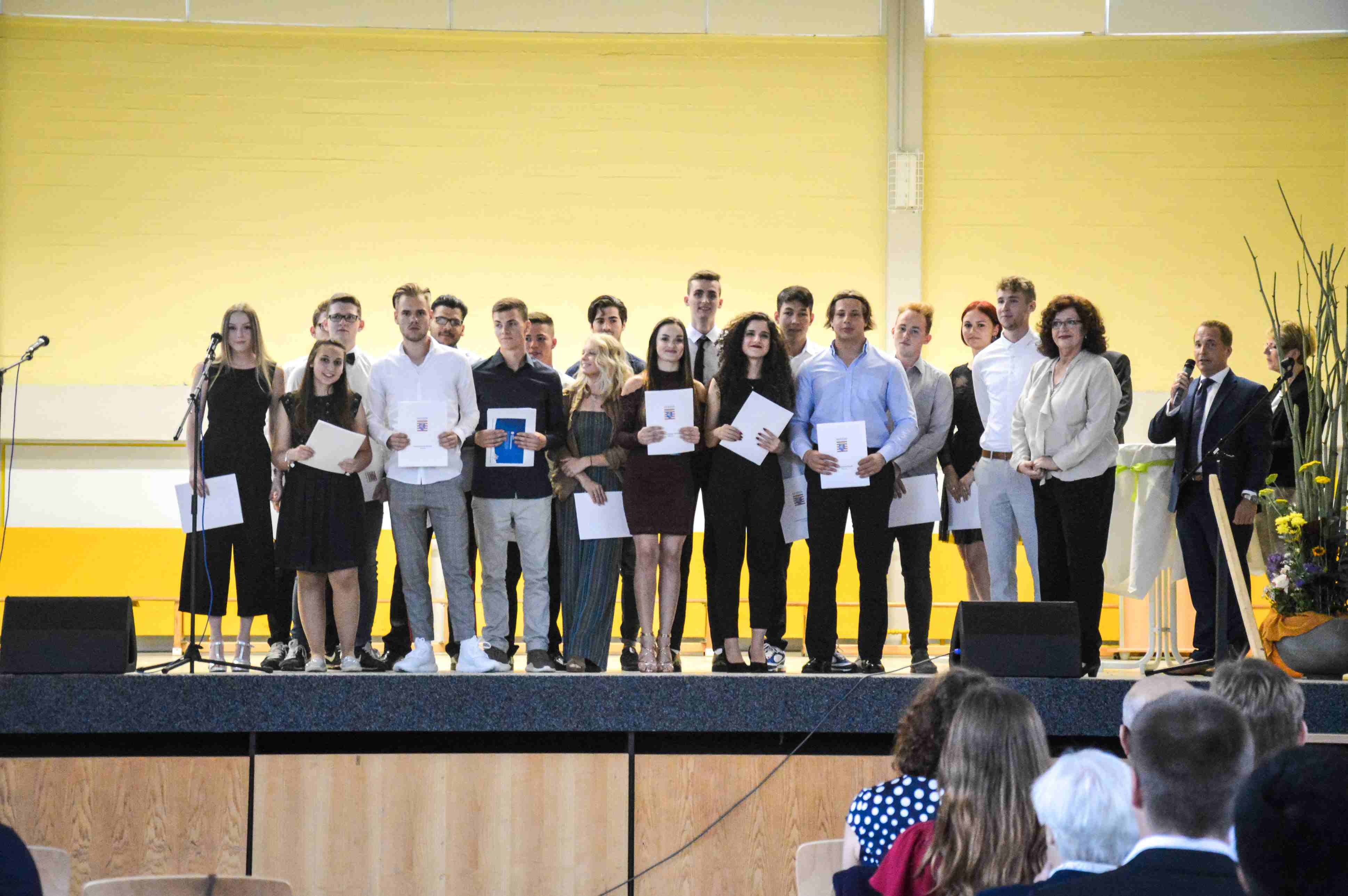105 Schülerinnen und Schüler haben erfolgreich die gymnasiale Oberstufe absolviert und erhielten in der Gutenberghalle ihr Zeugnis.